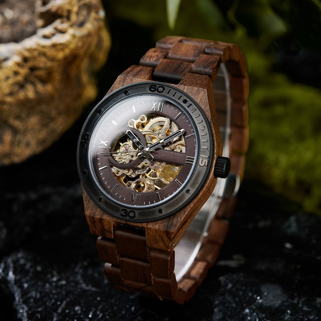 Un reloj de madera es ideal para la persona perspicaz que aprecia piezas únicas. Esta actualización moderna del steampunk clásico seguramente será un tema de conversación cada vez que lo uses. Tiene una banda de madera ajustable que muestra su grano de madera bellamente natural. El Mecánico tiene un movimiento japonés automático, por lo que no necesita batería. También viene con un cilindro de bambú hecho a mano.
