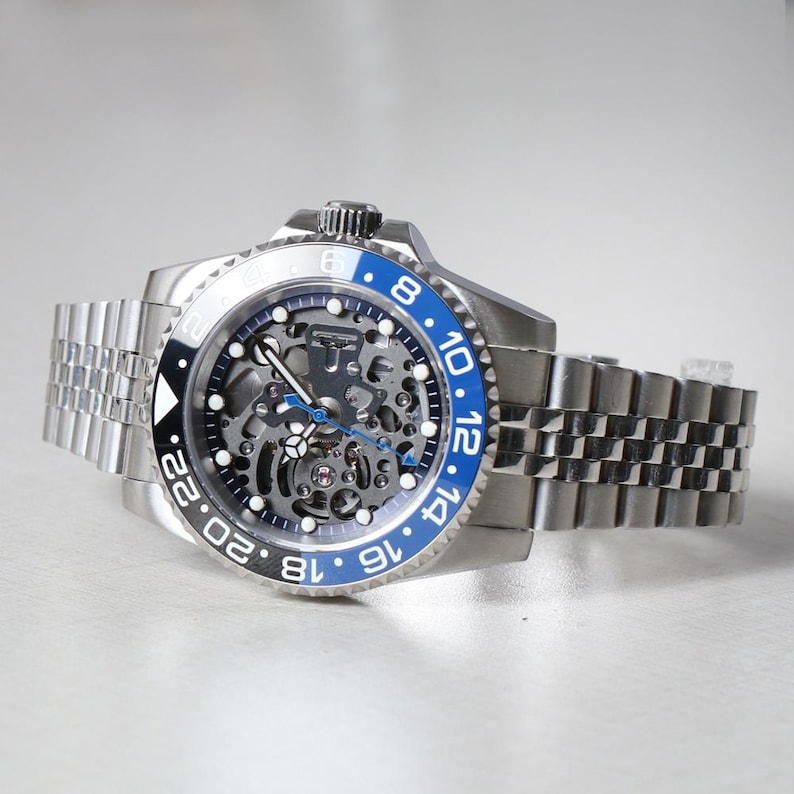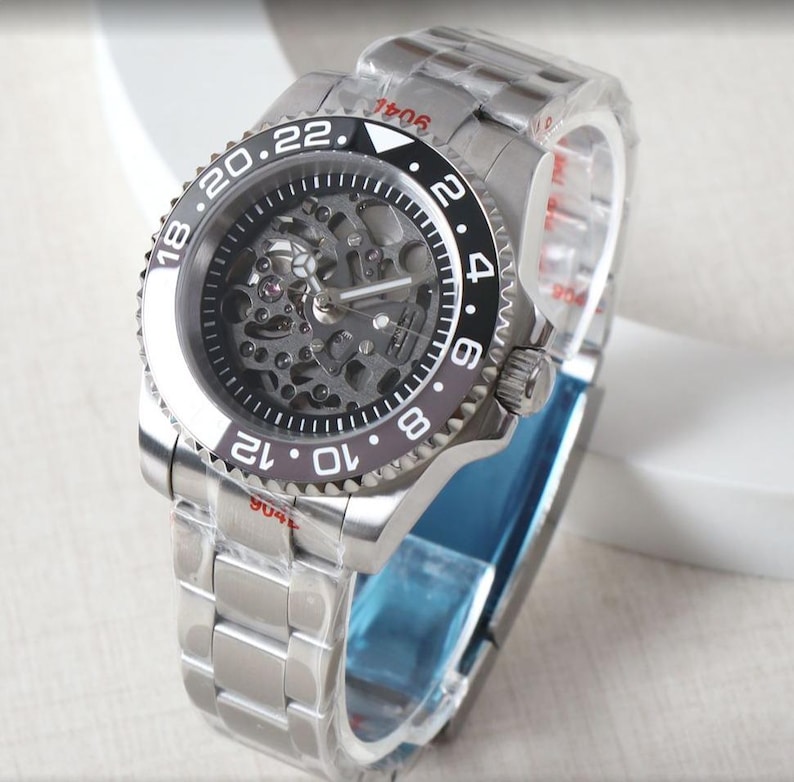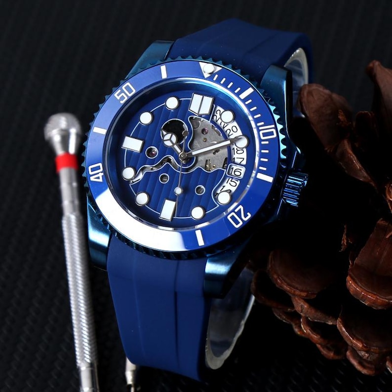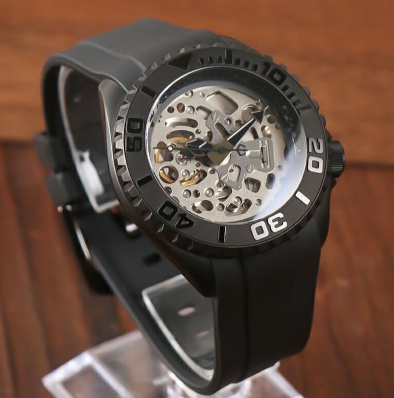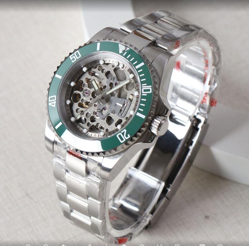Each timepiece is carefully assembled with high-quality materials, revealing the intricate details of its automatic mechanism through a transparent dial.