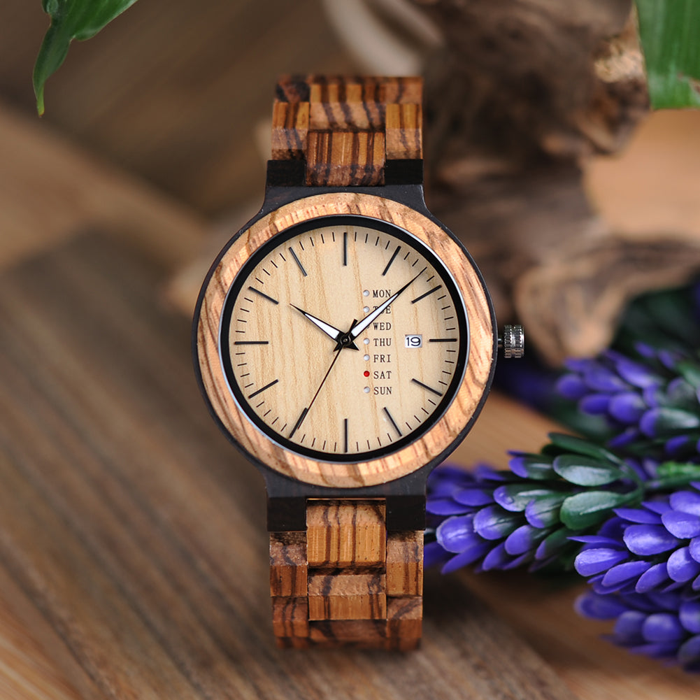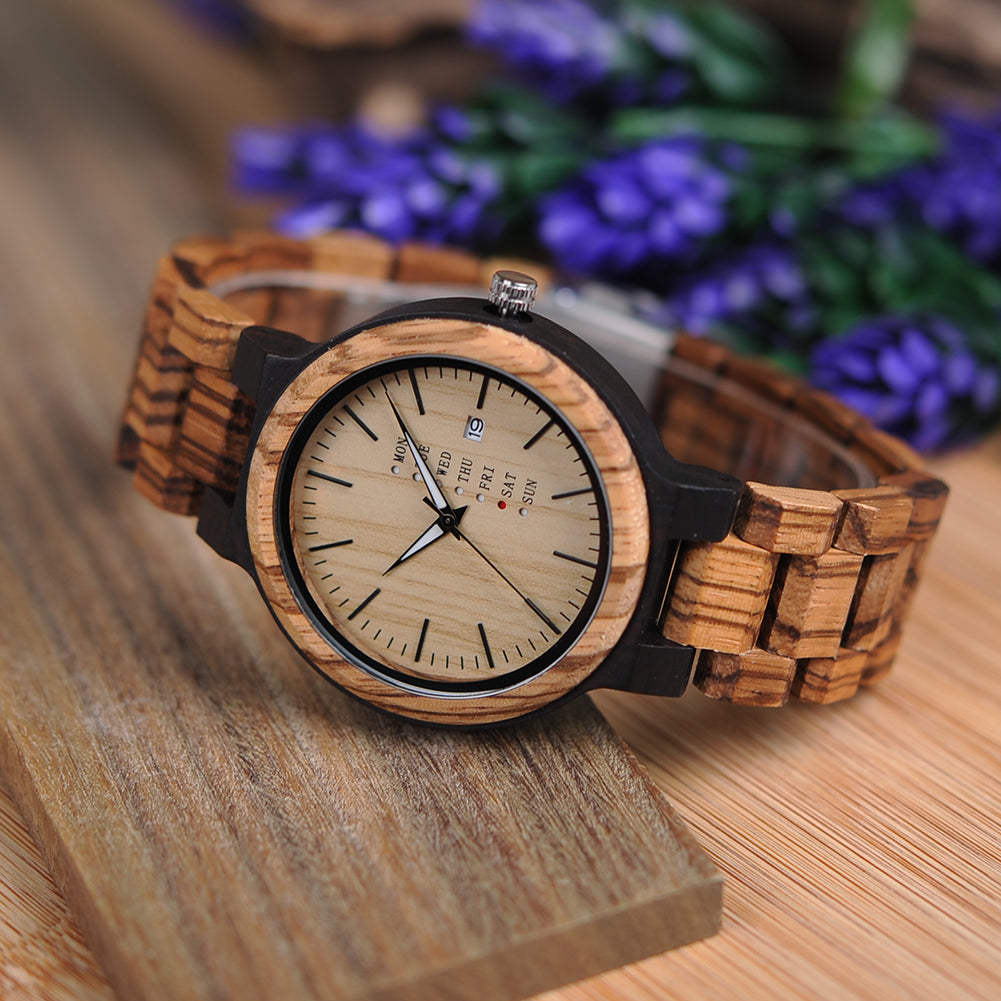 A wood watch is perfect for the discerning individual who values one-of-a-kind pieces. Stay stylish and on schedule with this handcrafted wood watch. Featuring an adjustable wooden band that showcases its beautiful natural wood grain. The watch also includes a handmade bamboo cylinder for a unique touch.